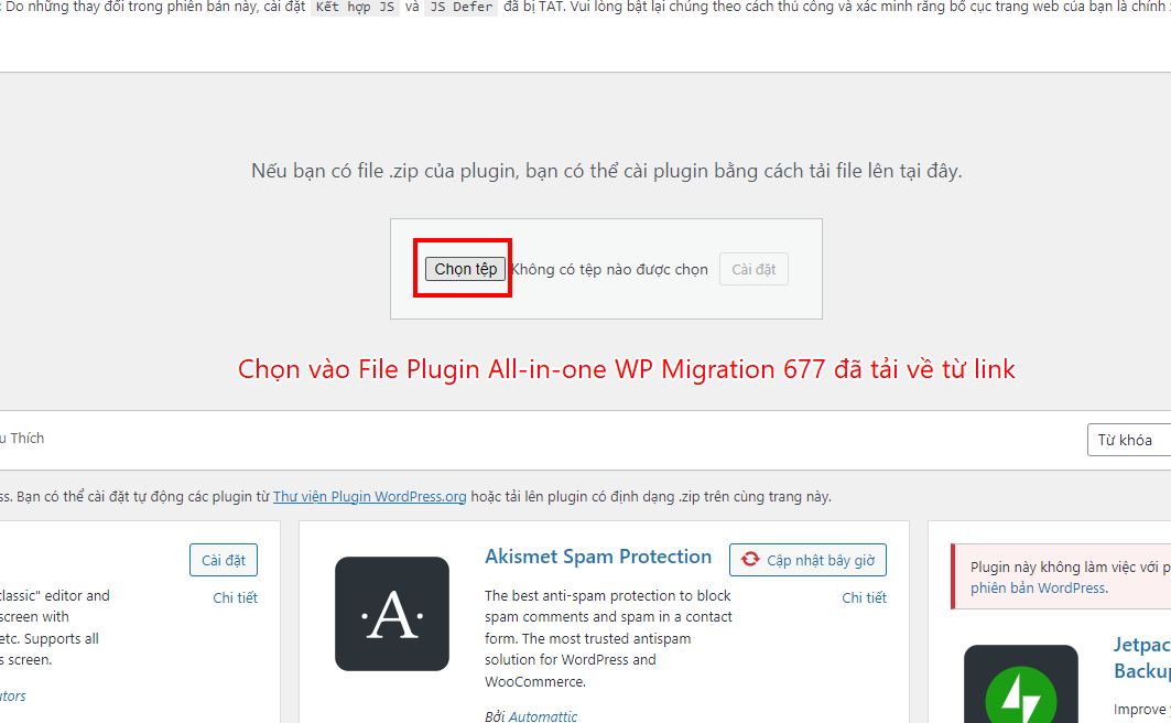 Các bạn tiến hành tải Plugin All-in-one WP Migration 6.77 về và tiến hành cài đặt như bình thường (Ngừng và xóa các phiên bản Plugin All-in-one WP Migration hiện tại)