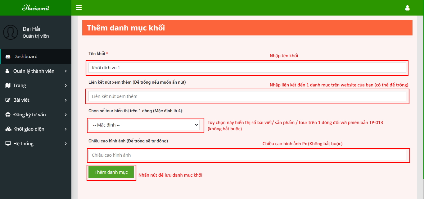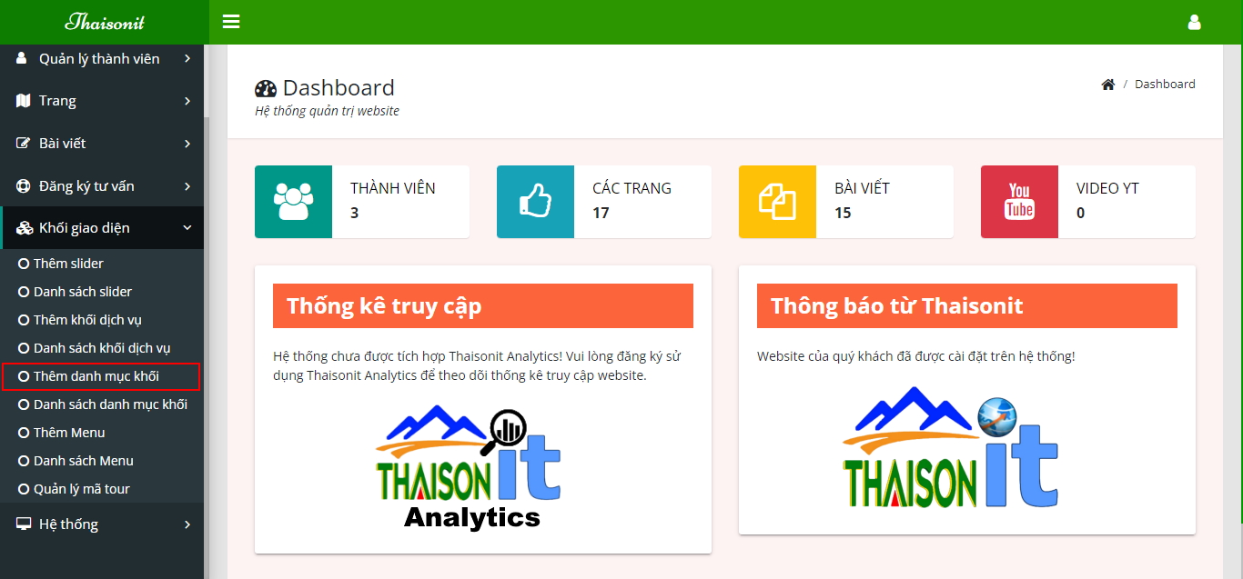 (Hướng dẫn chỉnh sửa thêm danh mục khối và thêm khối dịch vụ trong quản trị website sử dụng Thaisonit admin panel khi sử dụng dịch vụ web của SNETTECH)