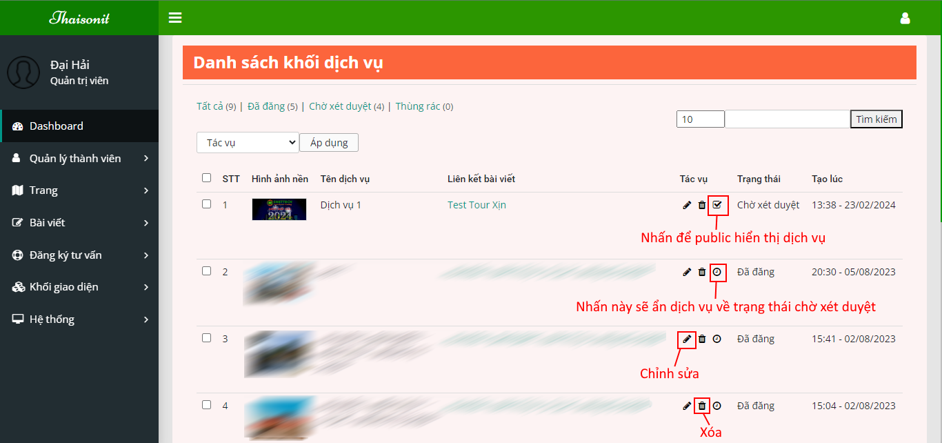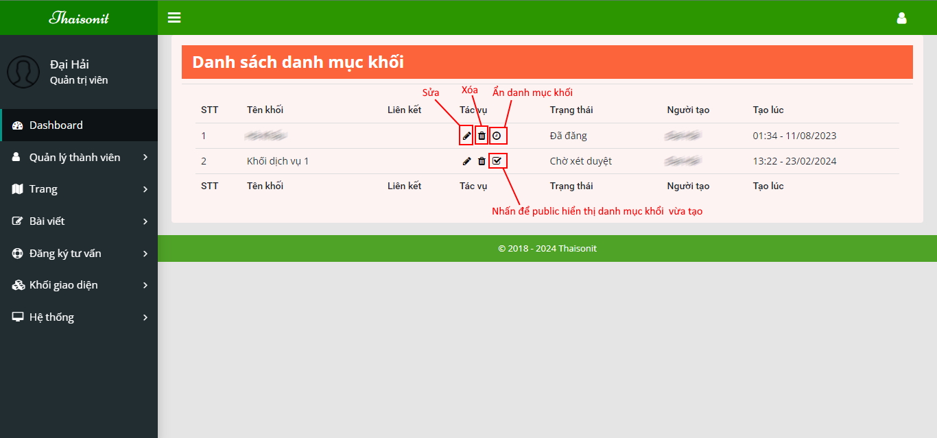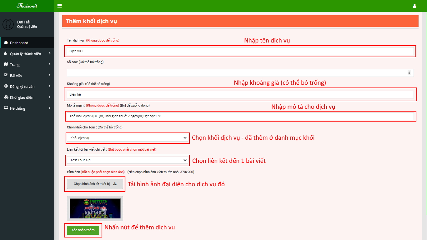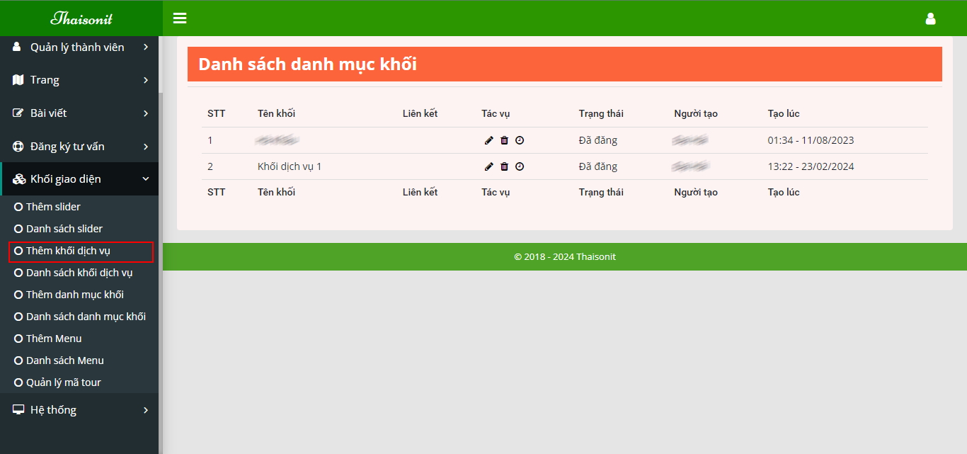 Hướng dẫn chỉnh sửa thêm danh mục khối và thêm khối dịch vụ trong quản trị website sử dụng Thaisonit admin panel khi sử dụng dịch vụ web của SNETTECH.